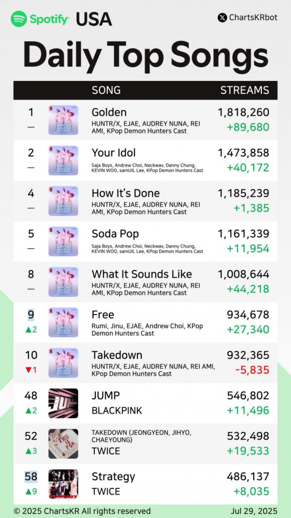 《케이팝 데몬 헌터스》의 사운드트랙은 빌보드 앨범 차트에서 2위까지 오르며 2025년 가장 높은 순위를 기록한 사운드트랙이 되었습니다. 총 12곡으로 구성된 사운드트랙은 75,000장의 앨범 유닛 판매량을 기록하며 상업적으로도 큰 성공을 거두었습니다.